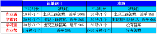 针对四款软件分别使用无法在题库中检索到的难题,和能在题库中检索到的简单题进行同时对四种软件进行测试(问他作业和作业帮都仅测试学霸回答结果)。结果发现: