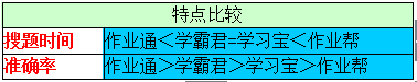 作业帮是采用在线答疑的方式。作业通、学霸君、学习宝都是题库匹配的方式。