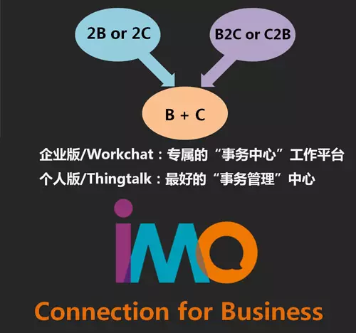 值得警惕的是,在B2D“红火”的表象之下,其实隐藏着几处危险的大坑。以国内某B2D公司为例,它能为APP开发者快速实现应用内的通讯,而在对外宣传——特别是在争取融资宣传时,它把客户的APP装机量也计入到自己名下,肆意制造“用户多达上亿”的虚假数据。再次,B2D的实际服务对象,主要还是一些缺少资金、技术和服务能力的小团队、小企业,都是精打细算的抠门主儿。但凡稍大一些的团队或有能力的个人开发者,都会优先考虑自己解决,而不假以他人之手。 如是看来,2B、2C虽然概念普通,但对于保障创业公司盈收方面仍然比较靠谱的。另一方面,打破单一的2B、2C模式,向着B2B2C的方向提供综合化的服务,已经成为一种新的创业趋势。以企业社交这个市场为例,单纯的2B或2C服务都已经无法覆盖更大的市场空间,最近新晋问世的imo班聊在业内首创了全新“B+C”战略,让我们一起来看一下它是如何开拓市场的吧——